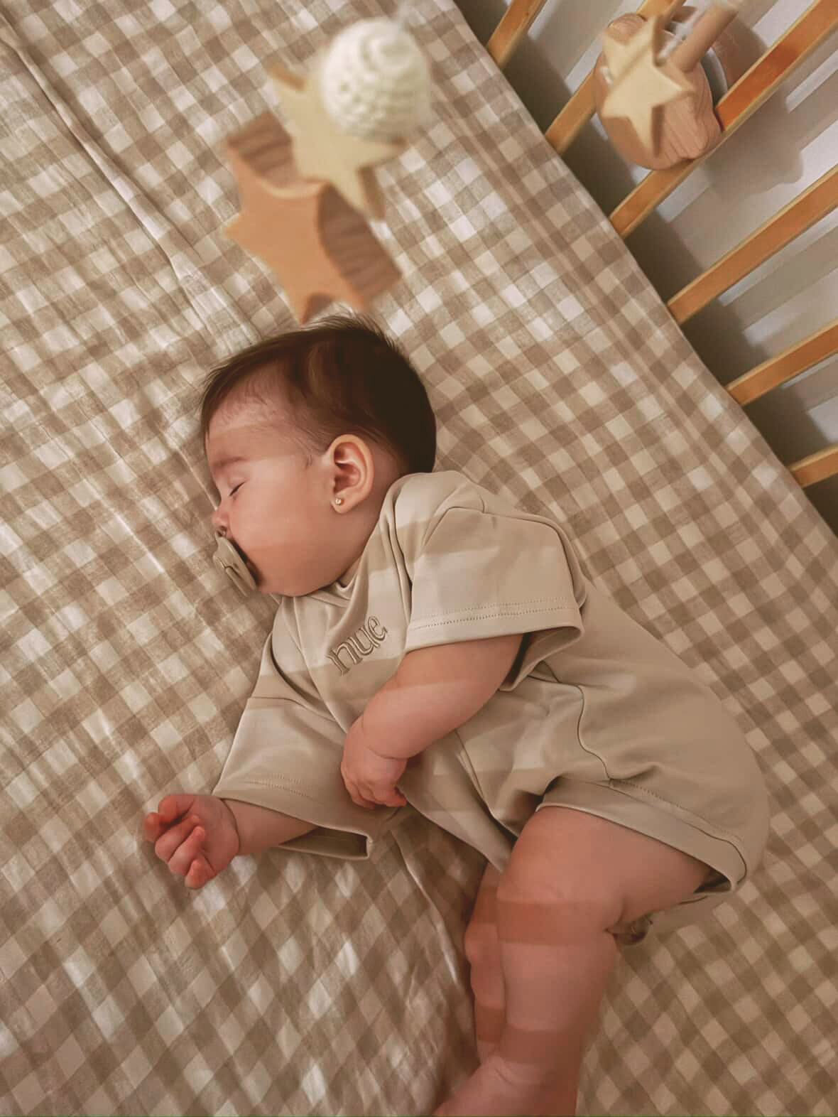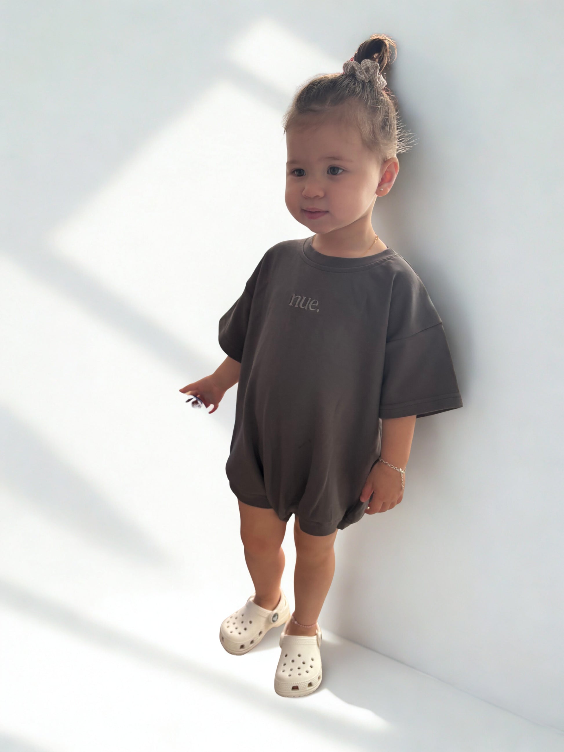 The romper has an intentionally oversized, relaxed fit for easy movement and comfort. Choose your child’s usual size for a roomy, everyday look. If you prefer even more length or extra layering space, you can size up. The stretch knit fabric also allows for natural growth, giving your little one extended wear over time.
